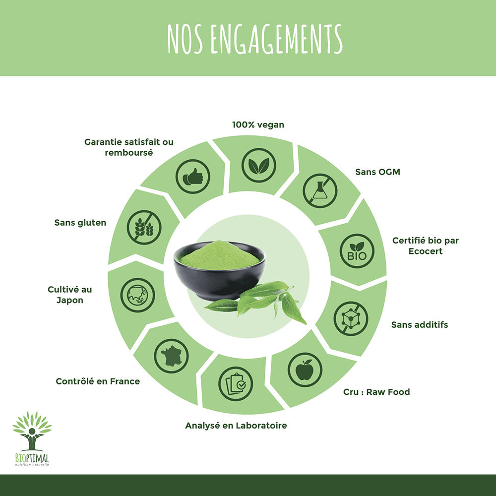 Nous avons sélectionné un thé matcha, d'une excellente qualité nutritionnelle et gustative, il est produit selon la tradition Japonaise à Kyoto, Uji. Garanti vegan, sans additifs, ni métaux lourds, ni ogm, ni pesticides, ni gluten, ni maltraitance animale, notre matcha est contrôlé dans notre atelier familial en France et certifiée agriculture biologique.