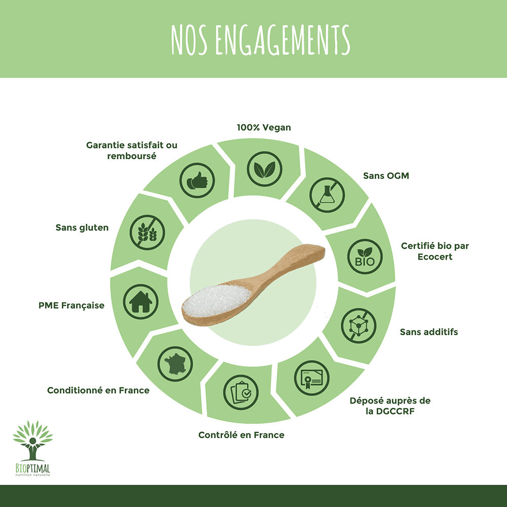 Nous avons sélectionné une poudre d'erythritol pur, d'une excellente qualité nutritionnelle et gustative, que nous conditionnons en sachet refermable afin de conserver tout son arôme et son croquant. Issu de l'amidon de maïs bio, notre érythritol est garanti sans additifs, ni colorants, ni sucres, ni métaux lourds, ni ogm, ni pesticides, ni gluten, ni aspartame, il est contrôlé dans notre atelier familial en France et est certifié agriculture biologique.
